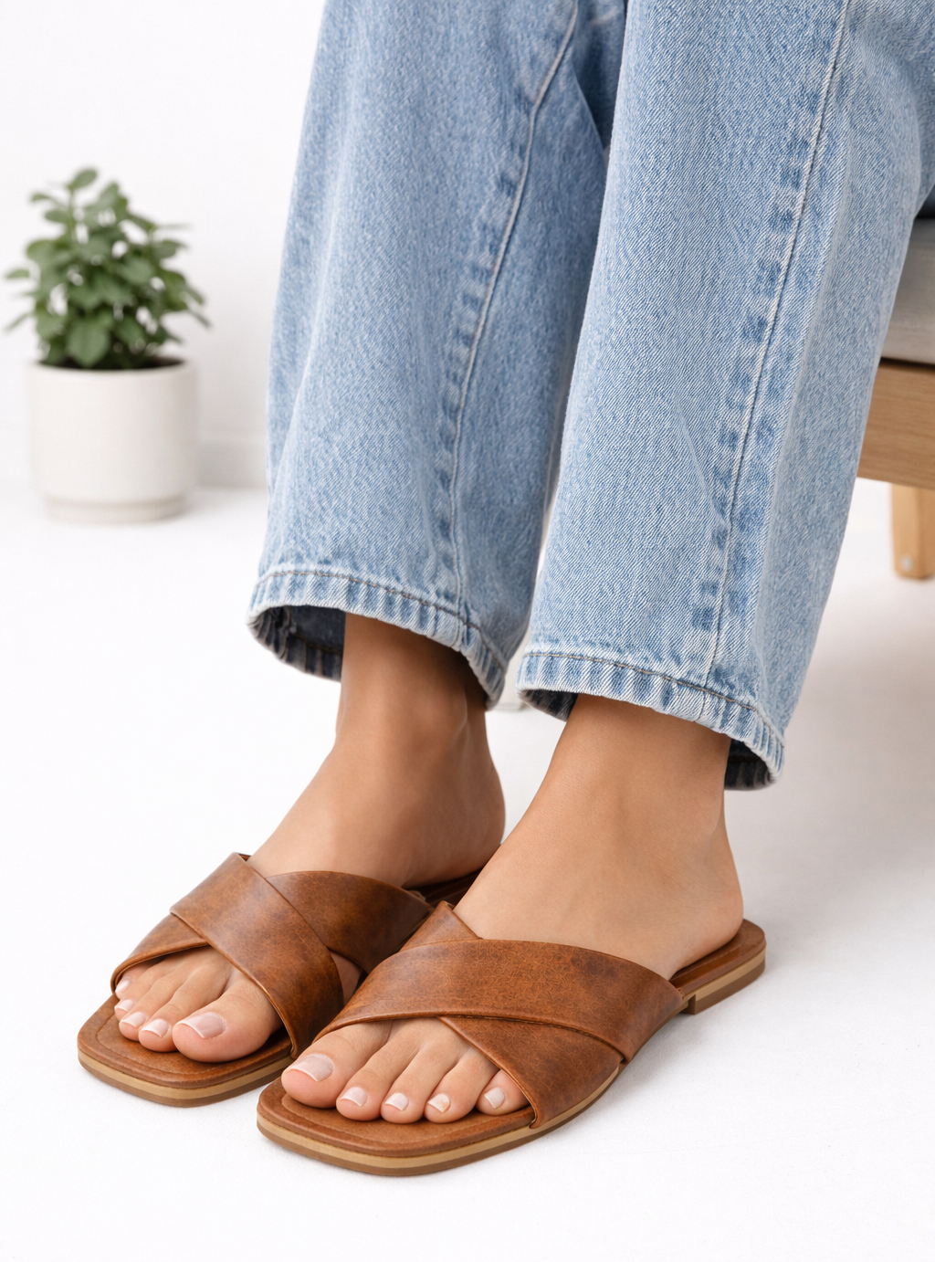 Classic tan cross-strap flats with a cushioned footbed, designed for everyday comfort and effortless style.